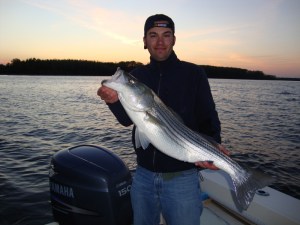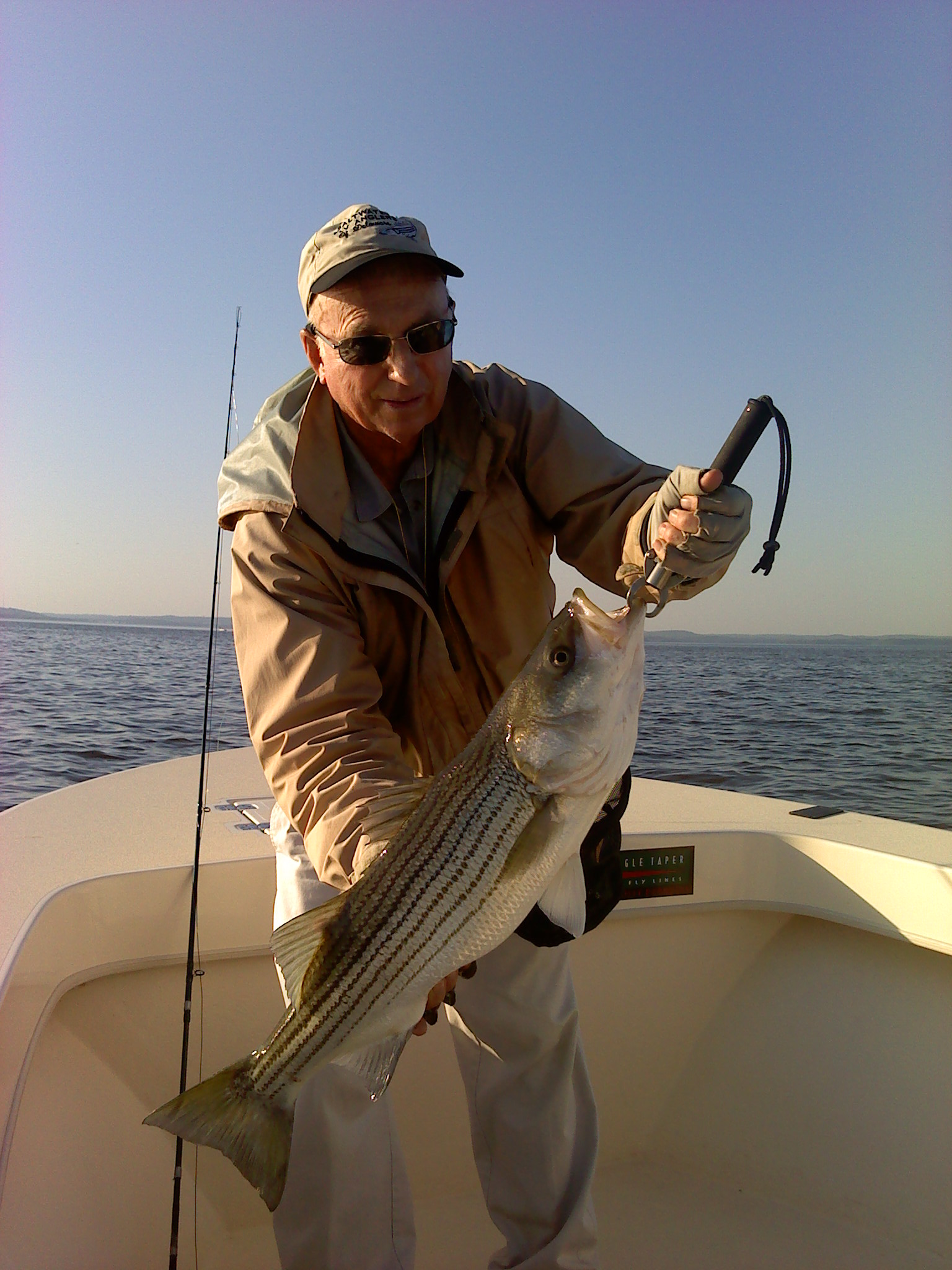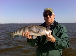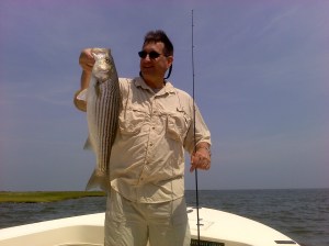 Plenty of rockfish from two to six pounds came in the boat, and one BIG fish was hooked, briefly showed itself, and promptly released itself before we could get an accurate estimate of size. Let’s just say it brought back memories of the blowups that you see fishing topwater on the Susquehanna Flats. All-in-all, it was a great morning, and we left them biting to stop in Tylerton, Smith Island at Drum Point Market for a crab cake sandwich. Pictured to the right is Gene Jones with a Monday morning rockfish.