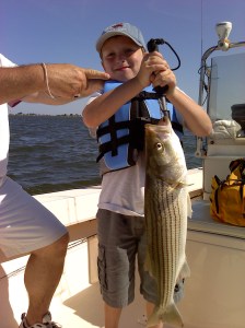 It was a beautiful day, but with a bit of wind. Owen said he was game so we made the long trek to the western side of Tangier Sound and points south. As we began casting shad tails on quarter ounce jig heads the fishing was not exactly what you would call fast. After some searching, with just a fish or two to show for our efforts, Owen latched on to something big and fought it like a seasoned pro. It was touch and go for awhile, but Owen gained the upper hand and after a good battle he managed to bring the fish boatside. It was a beautiful seven pound striper! Way to go Owen!! After a few quick photos we released the fish to fight another day. We quickly caught a few more stripers but Owen’s fish took top honors for the day. It was a half day trip so we made it back to the dock in Crisfield just in time for lunch.