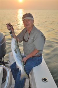 The next evening I fished with Matt Zuiderhof and his friend Brian Holt. We pulled away from the ramp in Madison on the Little Choptank at around 2:30 P.M. After a moderate sail up towards Sharps Island Light – all the while searching high and low for any signs of breaking bluefish – we finally found a school that stayed up for awhile. We caught maybe six to ten nice blues up to 4 1/2 pounds. Once hooked, I do believe the blues were out of the water as much as they were in, as they did a tarpon proud with their tail walking theatrics. There were several small stripers mixed in with the blues. Like Monday, we traveled to the shallows for some evening popper fishing. While we managed a few fish late on poppers, the hot ticket tonight was a Storm Wildeye Shad. For the better part of two hours Matt and Brian caught rock after rock, with extended periods of fish on every cast. These were nice fish too, with most in the 20 to 24 inch range. Largest fish tonight was maybe 26 inches and I figure the guys boated over 40 stripers. Sorry no pictures, we were all kind of busy.