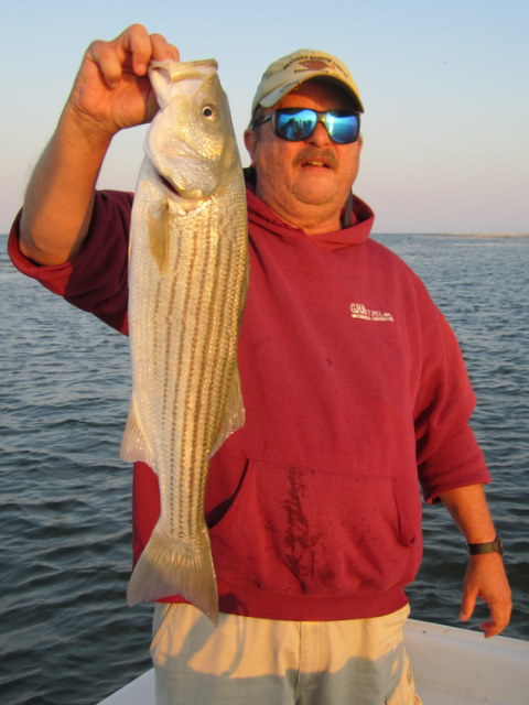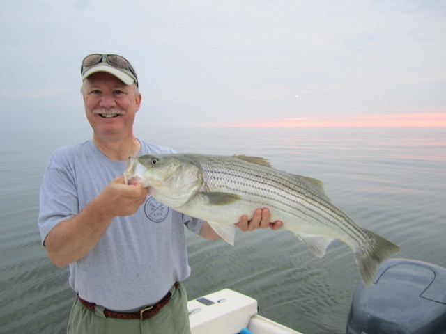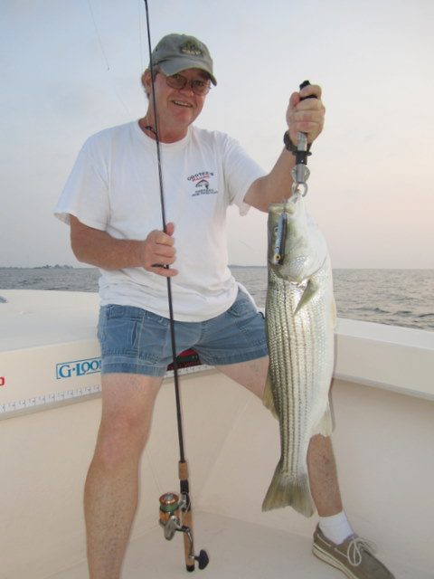 Wednesday, July 20 brought two local boys to my boat in Guy Griffin and Ron Perdue. You know, it hasn’t always been easy attracting native eastern shore folk to my business; since everyone down this way has access to a boat, plus they are all very good fishermen in their own right. Guy and Ron were no exception. The two really put on a show as they turned in one of the best topwater mornings of the summer. Over twenty rockfish crashed, cart-wheeled and smacked their Storm and Stillwater poppers all over the shallows of lower Tangier Sound. Beautiful, fat stripers to 28 inches helped convince the guys that they need to add a surface popper to their rockfish arsenal. Guy and Ron didn’t miss a beat adapting to the new method. After the morning bite slowed, both were anxious to get at the flounder. Fishing two areas that have been hot of late, Guy and Ron managed a limit a piece of thick-bodied flounder to 22 inches, and they boated nine total over 18 inches. Some nice fillets for the table were their reward for carefully releasing every single rockfish to fight another day.
