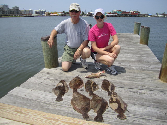 Friday, July 15 brought Bob Gray and Mike Schmidt to Crisfield for their first try at Tangier Sound shallow water rockfish. The rock did not disappoint. For the better part of an hour, both Bob and Mike enjoyed explosive strikes from stripers up to 28 inches. Both left impressed with the topwater theatrics and drag-screaming runs of a good-sized striper caught in shallow water. The flounder bite was next. The jigging technique that I use was somewhat new to both Bob and Mike, and while the fish made us work a bit, we did manage a limit a piece for both anglers. In all, eleven legal-size flounder were boated; all beautiful fish ranging in size from 18 to 23 inches. Mike even added a twist that left me impressed. His son Mike has developed a fish attractant product called the Fish Bomb. Mike Sr. made a believer out of me as he was top rod for the day, all the while spraying a shot of the juice onto his bucktail jig before lowering it into the water. The flounder really seemed to love it!