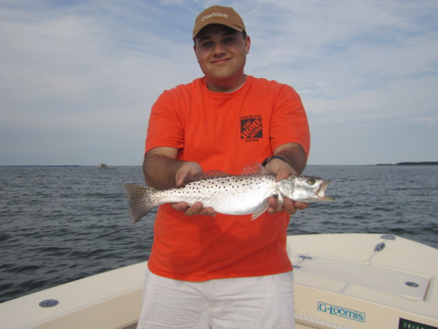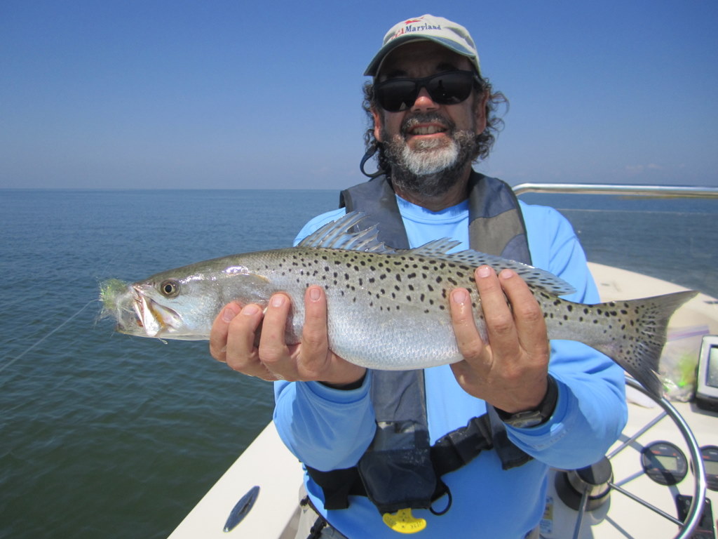 The Tangier Slam – or one version of it – is usually considered catching a rockfish, bluefish and speckled trout on fly during the same day. Well, this is the time of the year to come on down and give it a shot. That is, if I can get you away from the blues once you get here. Yesterday, we had six of the prettiest speckled trout that you ever want to see from 16″ to 20″ that we caught during a quick stop on the way in from a very successful day of watching rock and blues knock our poppers all over the sound. When the weather has cooperated, the fishing of the past two weeks has been phenomenal! Here is a brief summary of some of the highlights.