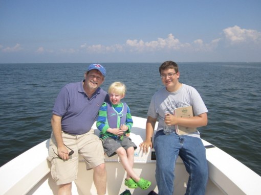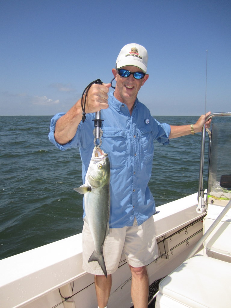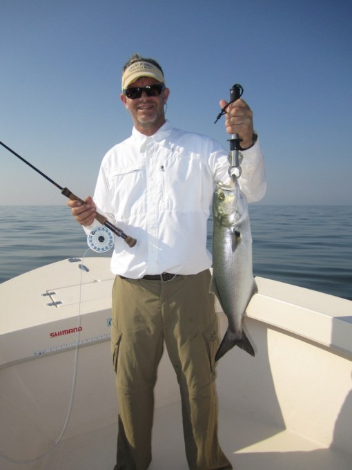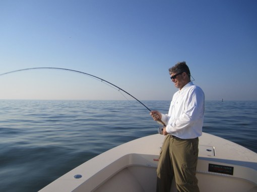 Tuesday, September 13– Lew Armistead and Donny McDougall brought their fly rods and were greeted with ‘slick cam’ conditions on Tangier Sound. We started off the day catching a few rockfish on sinking lines, but it didn’t come close to the top-water action that we had enjoyed the day before. With bluefish waiting to please, I pointed the bow east and told the guys to hang on. Upon arrival at a spot near Watts Island the guys were hooked up almost immediately. While Clousers and sinking lines worked well, both Lew and Donny quickly switched to floating lines and Gurglers for some of the most exciting top-water fly action that I have witnessed in a long time. Two to five-pound blues slashed, crashed and dove on top of the popping Gurgler, until both flies needed the occasional field repair. A simple piece of 15# monofilament was all that was required to restore the Gurgler to “nearly new” condition. Lew asked me what type of knot I had used to make the repair and I replied “lots of knots!” There’s no time for perfection during the heat of battle, therefore, I believe it was Lew who coined the name “Triage Knot.” I wonder if I should get a patent?? We even saved an hour at the end of the day to catch four gorgeous specks to 20″ up near Fox Island, thus, both Lew and Donny were able to accomplish the ‘Tangier Slam!’ Nice going guys.