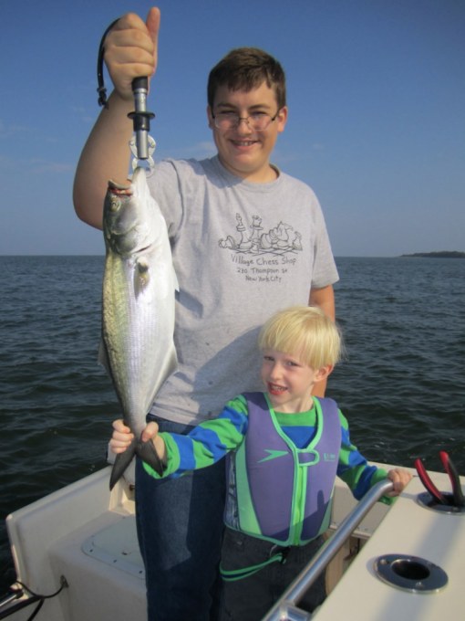Sunday, September 11 – I Fished with Gus McKee and his son Mac, along with Gus’ father-in-law Lou Pochettino and nephew Alex Pochettino. We found the mother lode of blues down near Watts Island and all hands had their fill. The 2 – 5 pound bluefish were all young Mac could handle on the light G. Loomis spinning rod, and the fellows sure kept the captain busy with the net! Great to see the younger generation get such a kick out of fishing. I believe Alex and Mac are ‘hooked.’