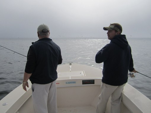 Wednesday, November 9 was a wild day, weatherwise. Dave Fetterman, his son Cory, along with Dave’s brother Kurt met me bright and early at the Somers Cove ramp in Crisfield, only to be greeted by a blanket of fog. While visibility was limited, we could see far enough to avoid a collision, so off we went. It was kind of neat actually, the GPS helped point me to a shoreline location that I wanted to fish, the sod bank would appear out of the haze, and more times than not there were rockfish waiting for our offerings. It was fun fishing and gave us a sense that we were the only boat on the sound. Later in the morning, as the sun burned-off the fog, we chased surface-feeding rockfish in the bay out near the target ship. A great day on the water with three great friends.