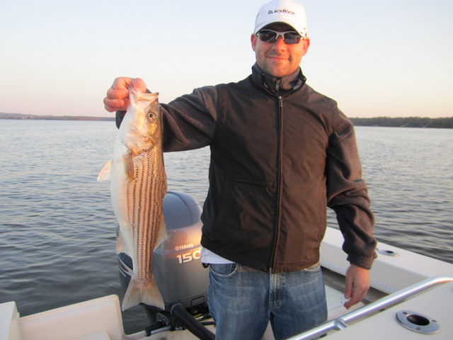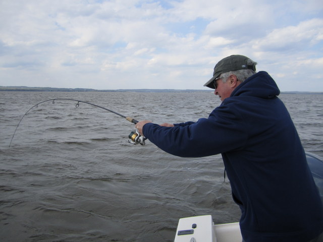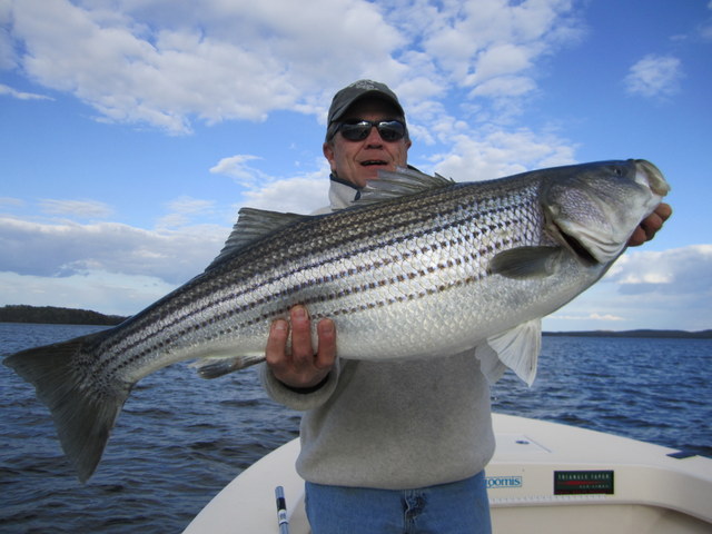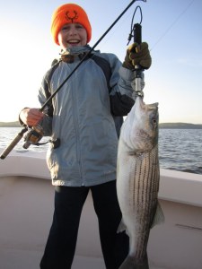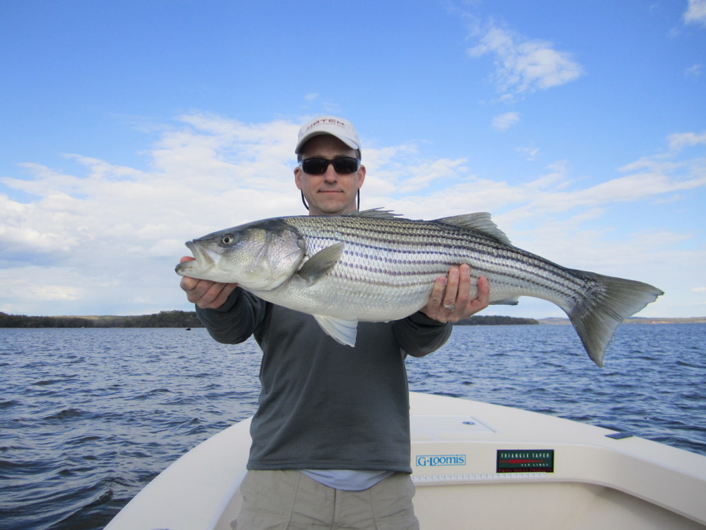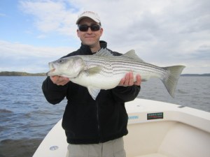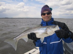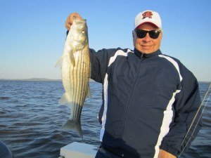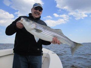 7 04 2012A quick update from the Susky Flats. Wednesday – Arrival date. By the time I got the boat launched and tied in the slip it was almost 6:00 p.m. Didn’t have anything else to do, so I decided to spend the last two hours of daylight looking around the flats. Wound up with some schoolies to 25″ and a surprise 15-pound striper that hit a six-inch Chartreuse BKD. Nice evening, wish I had had some guests on board. Thursday – Phil Bangert joined me for a day trip and we fished hard to land maybe 35-40 rock to 25-inches. No big fish this trip. Phil did manage to break out the fly rod and he proceeded to out-fish the spinning outfit! Fun morning. Took my Dad out for the evening trip and we hit a nice stack of fish east of the battery, most falling in the 16″ to 22″ range. Then I hit a drag-screamer that put the Stradic’s teflon washers to the test. I slowly pumped it back in and quickly measured a 36-inch, 22-pound beauty (sorry, no photo – didn’t want to keep her out of the water after such a game fight). With a healthy swat of the tail she was on her way, no worse for wear. That’s the appeal of the flats; one cast can be a 20-inch schoolie (don’t like the word dink, doesn’t do these fish justice) while the very next retrieve can bring on a drag-burning twenty-pounder. Friday – Bill Enos and his friend (also Bill) were the unfortunate recipients of a strong northerly blow which turned the flats the color of chocolate milk. There were two or three really big fish caught but not on my boat. A few schoolies around also, but many skunks to report as well. We elected to call our trip at noon. There are some really nice fish around and I think things will pick up once the waters settle a bit. Home for Easter with the family and will be back at it bright and early Monday morning. Happy Easter everyone!