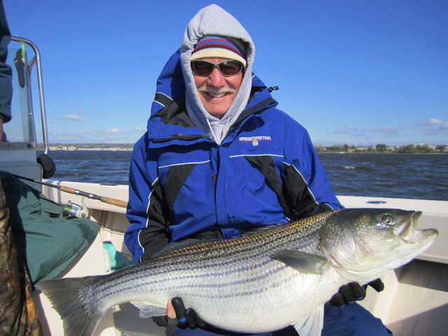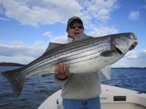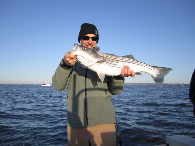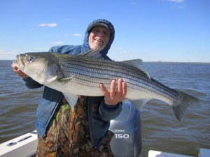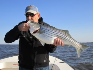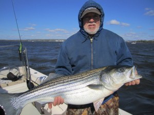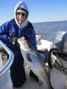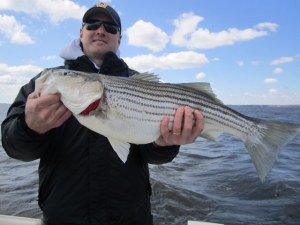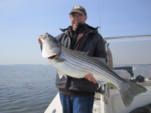 Here is a quick look at my first full week fishing the Susquehanna Flats. Despite the relentless westerly wind – which most days blew at a steady 20-25 mph – we managed to catch a good number of rockfish, along with some reel drag-burners! From Tuesday the 10th to Saturday the 14th, my clients boated 14 stripers of 30-inches or better, with two over 40. The bulk of the big rock measured in the 33″ – 38″ range. Largest fish of the week was a 41-inch trophy that would most-likely have bottomed the scales to near 35 pounds. Several days saw as many as 80 school-sized rockfish from 16″ – 28″ brought boat-side. Enjoy some photos of this past weeks action.