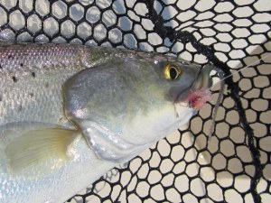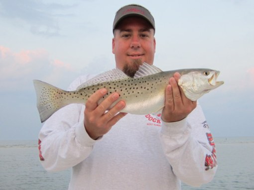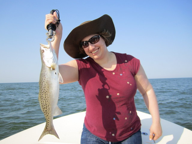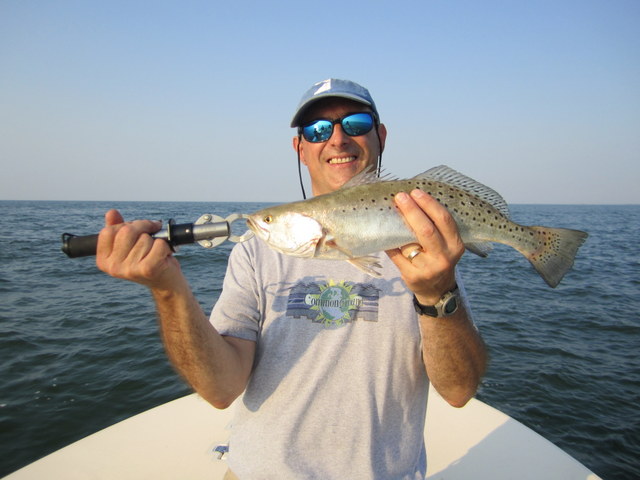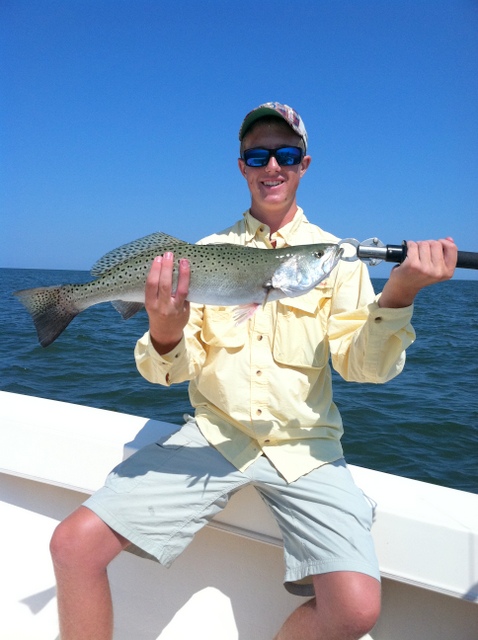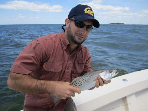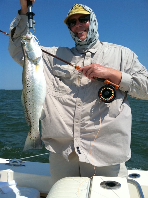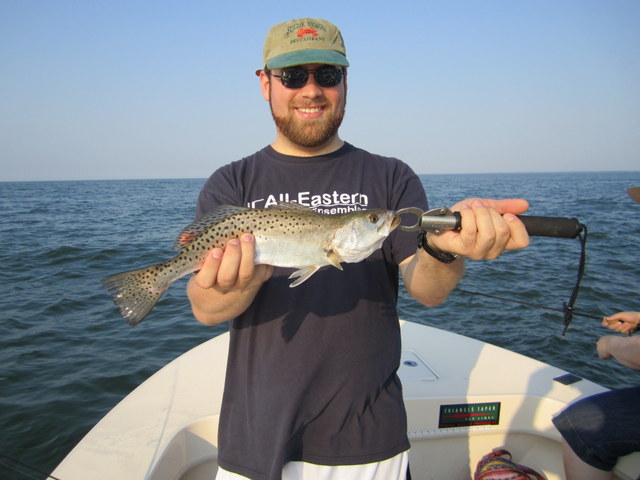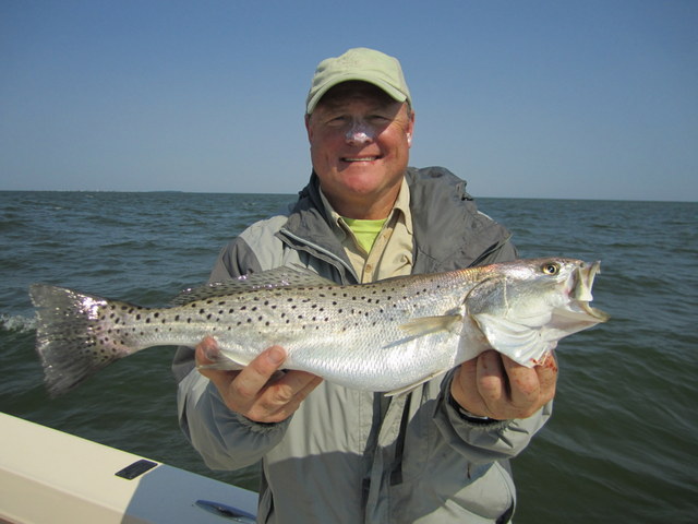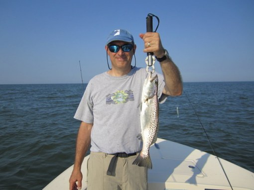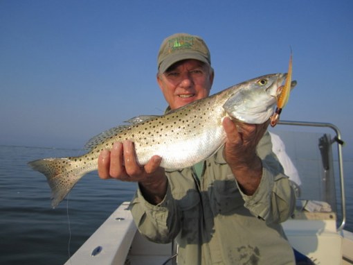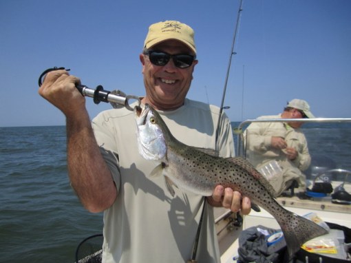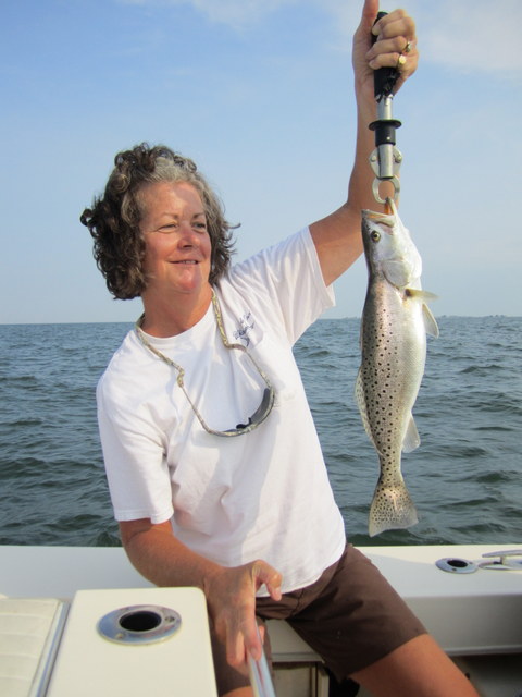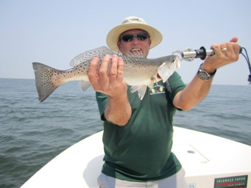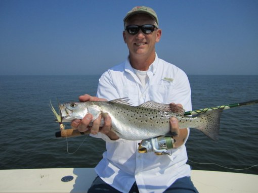 Bring on the heat!! Even with the sweltering temperatures of late, there has been no let-up in the speckled trout bite! Given decent weather and a break from the wind, on most days we are catching 20 – 30 fat, healthy specks on a variety bucktail jigs, soft plastics and flies. Specialized Baits Li’l Jimy’s, Bass Assassin 4″ Sea Shads, Clouser Deep Minnows and Cactus Stripers are all gobbled-up like cotton candy at a carnival. I have seen stretches of good speck fishing in my 30 years of fishing Tangier Sound, but never have I experienced such a prolonged period in both size and numbers. The specks are averaging 17″ – 21″, and this past Monday, Dennis Dame boated a gorgeous five-pound, 25″ specimen on fly. With a little luck, look for this incredible fishing to continue right through October. On the flip-side, the fantastic flounder fishing that we had last summer has, so far, failed to materialize. That said, I haven’t been putting in a lot of time trying, for obvious reasons.. Bluefish to 20-inches are available if you want a hard-fighting gamefish to put a bend in your light spinning or fly rod and a few stripers are always around. I have less than a handful of dates remaining open in July, and August is fast becoming booked as well. Drop me an email or call if you would like to get in on some hot summer fishing. If a full day sounds a bit too long in this heat, the less-expensive six-hour trip is plenty of time to fish a tide, and we will be off the water before the oven cranks up!