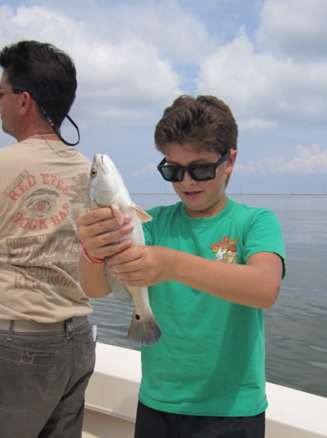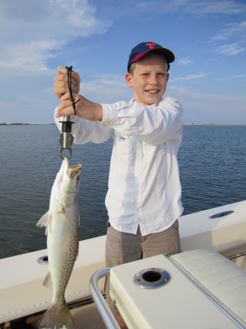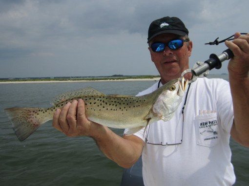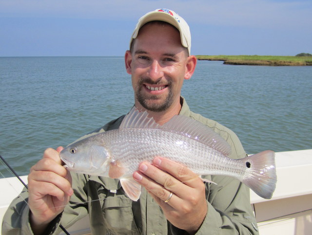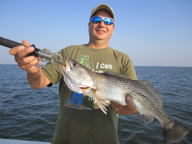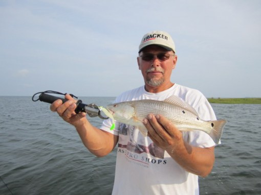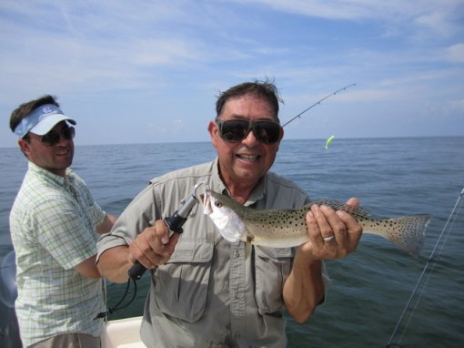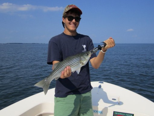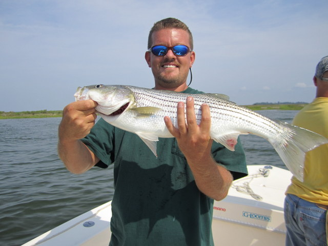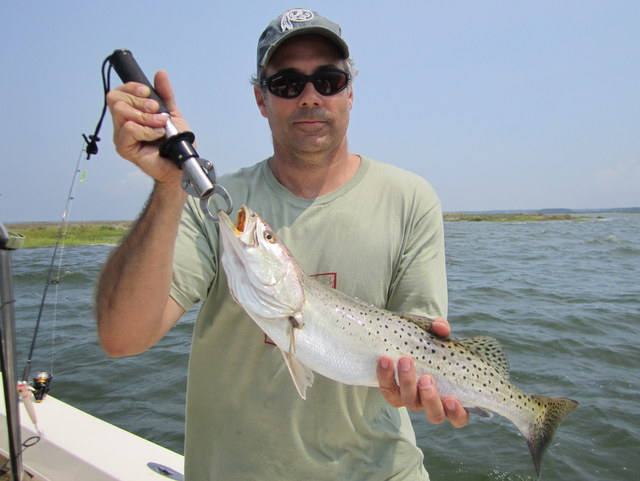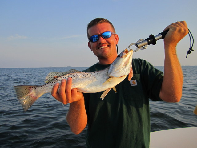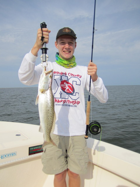 quite reach six-species, sheer numbers made up for the species count. We began the day casting to breaking bluefish in the 12 to 17-inch range, enjoying action in which triple hook-ups were common for perhaps ninety minutes. We switched gears to look for specks, managing close to a dozen for the day up to 21-inches. Mixed-in with the trout were perhaps fifteen nice rockfish to 24-inches. The day ended on a hot note as the guys simply tore-up the puppy drum, landing maybe 50 in the 12 to 17-inch range, with a couple just shy of the legal 18-inch limit. All told, over one-hundred fish were boated giving the three anglers a day to remember. And to make his “slam” something really special, young Connor also accomplished several “firsts.” As is first striper, first bluefish, first speckled trout and first redfish! Way to break-out on the saltwater scene Connor!! Tangier Sound has always held a nice variety of game fish during the summer months and six or more species in a days fishing is not unusual. I look for this fantastic shallow water angling to continue right through the fall months.